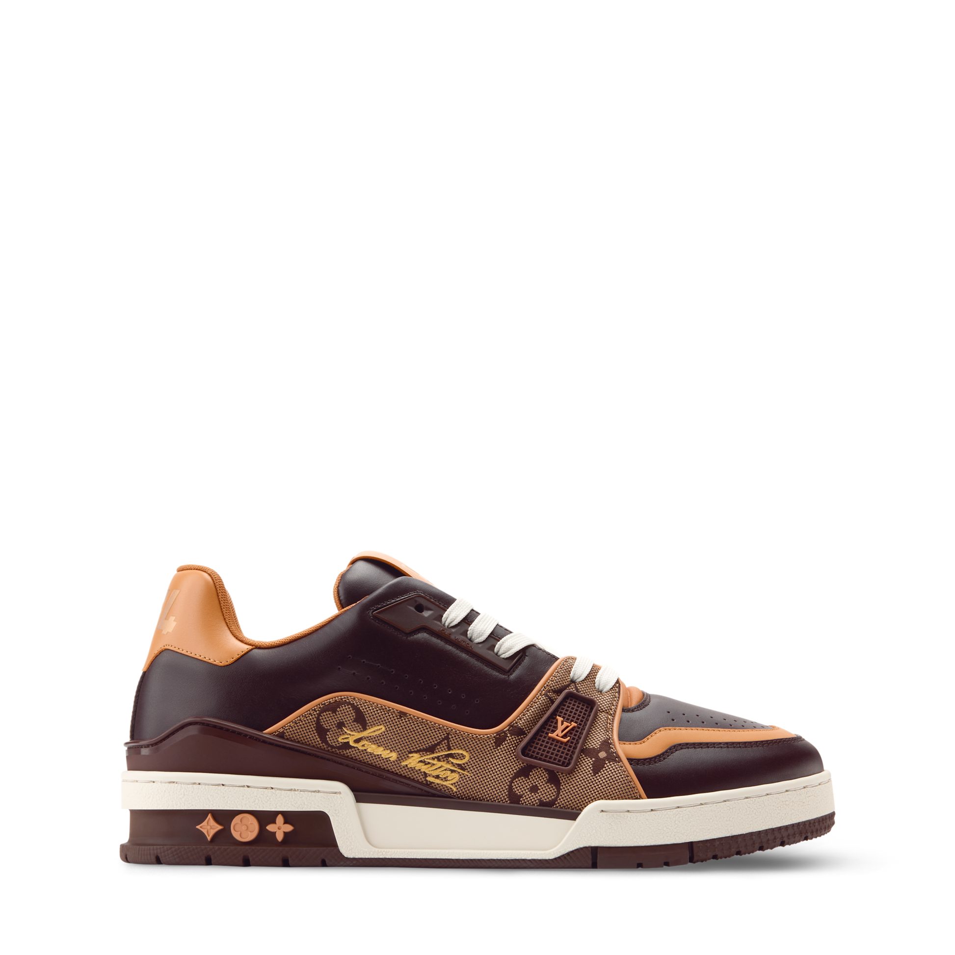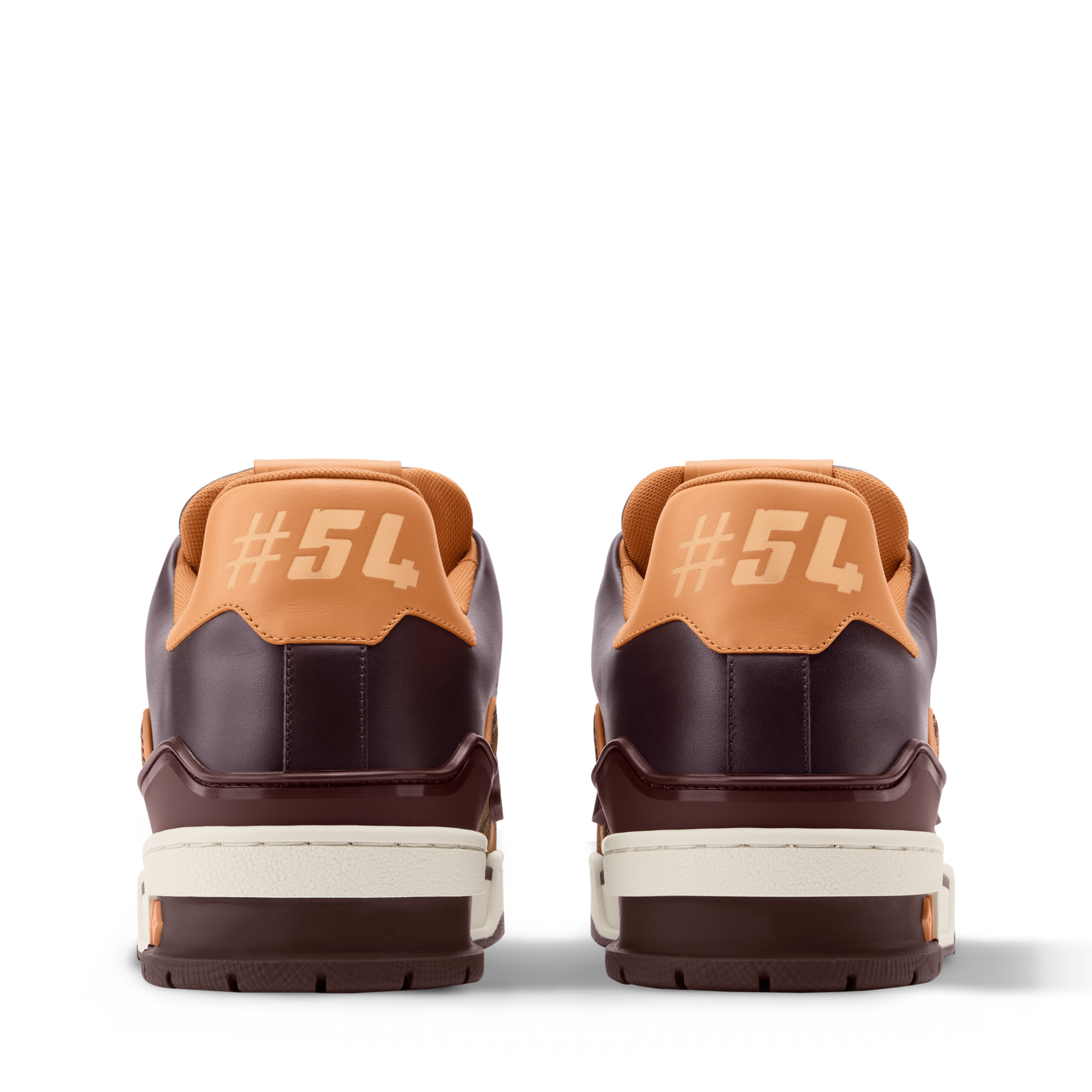 This iteration of the LV Trainer sneaker combines Monogram jacquard fabric with smooth calf leather, highlighting the intricate construction of the design. Inspired by vintage basketball sneakers, this model showcases a refined mix of textures and craftsmanship. At the back, natural leather trim features the #54 signature, referencing 1854, the year the House was founded.